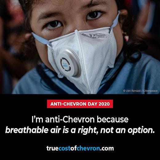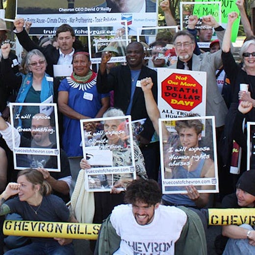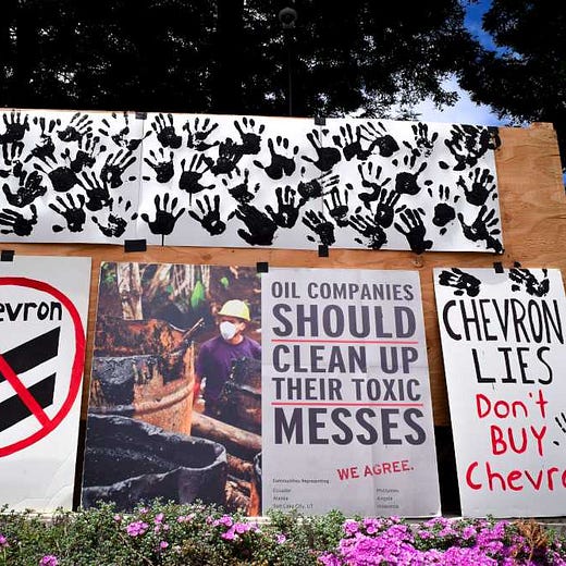Good morning and happy Friday. Yesterday was International Anti-Chevron Day, an annual day of protest (this time, online) during which hundreds of environmental advocacy groups, human rights organizations, and scientists across the globe spoke out against one of the world’s biggest culprits in climate destruction. Chevron doesn’t always get the same level of attention as, say, the namesake of this newsletter. So this week, I thought it would be prudent to talk about Chevron’s history of swindling the public for profit — and the growing effort to hold them accountable.
