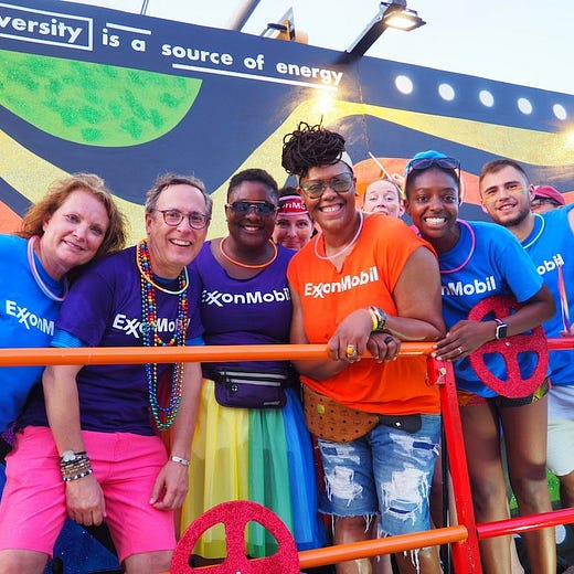 Exxon has been promoting its supposed allyship with LGBTQ+ employees for years. Every Pride Month, the company takes to social media with rainbows galore, testimonials from employees advertising Exxon’s commitments to diversity and inclusion, and photos of its PRIDE group boasting company logos in celebration.