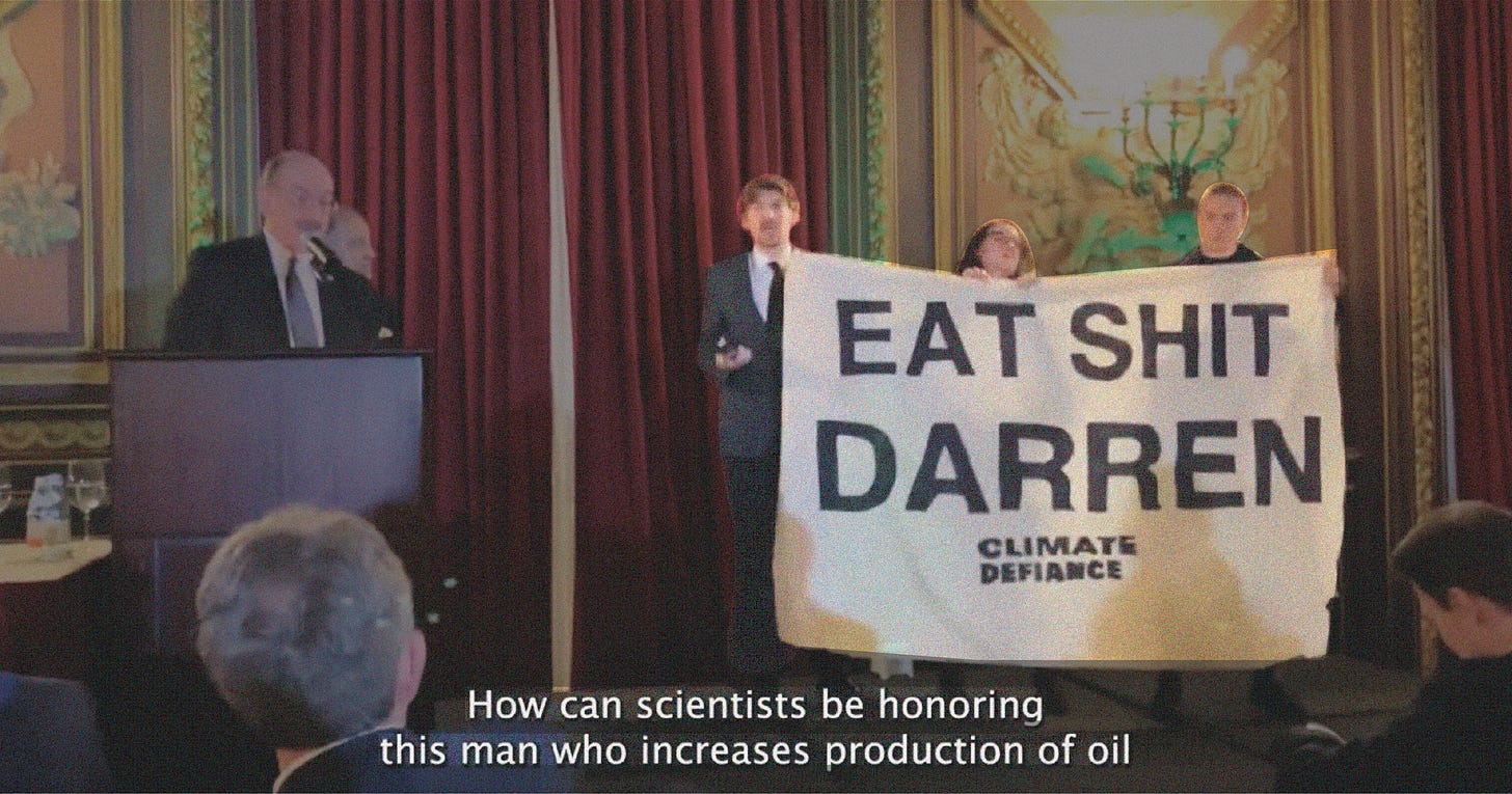 This kind of disruption is only gonna happen more and more until we witness change. So on the micro level, I would hope that CME rethinks awarding someone like Darren Woods in the future. We've made it very clear to people in that room why we were there. And because it was a science-minded crowd, we had more sympathy at this than almost any other disruption we've done. People were coming up to us individually, both inside the room and once we were outside, saying, you know, it takes a lot of guts to do that and he should be called out, and things like that. Although of course all it takes now is to see a video of a climate disaster, if you have an advanced degree in science, you know that it's undeniable what fossil fuels and what Darren Woods is doing to the planet. So that was certainly encouraging.