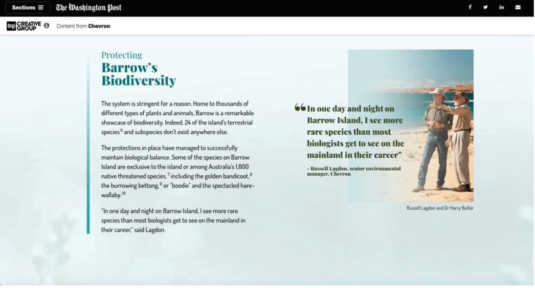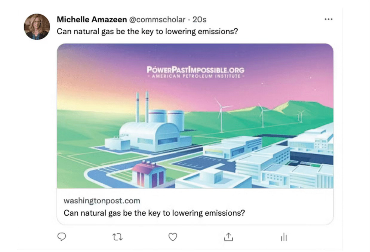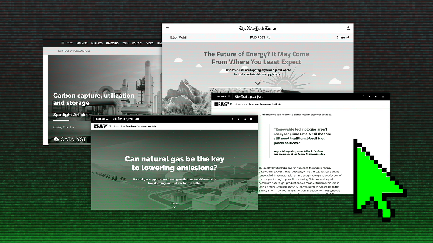 Many of the native ad campaigns documented by Amazeen, a researcher and professor at Boston University, were created by mainstream media outlets on behalf of major oil companies and their trade associations over the past decade. The campaigns often advertise controversial technologies like carbon capture as climate solutions, portray fossil fuel companies as climate-friendly, or misrepresent their role in the energy transition.