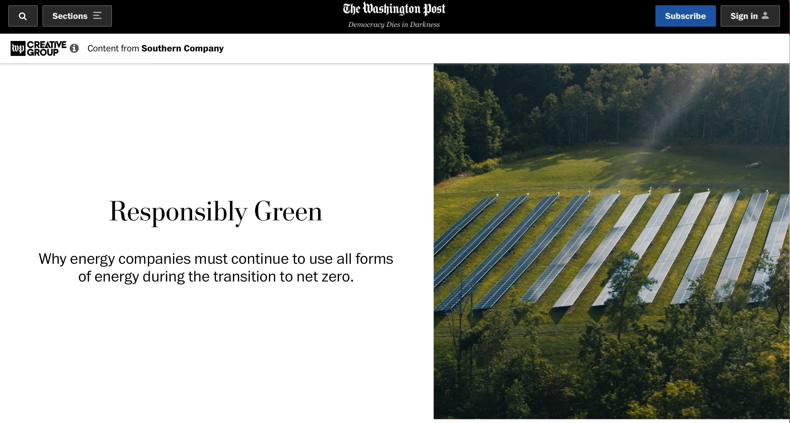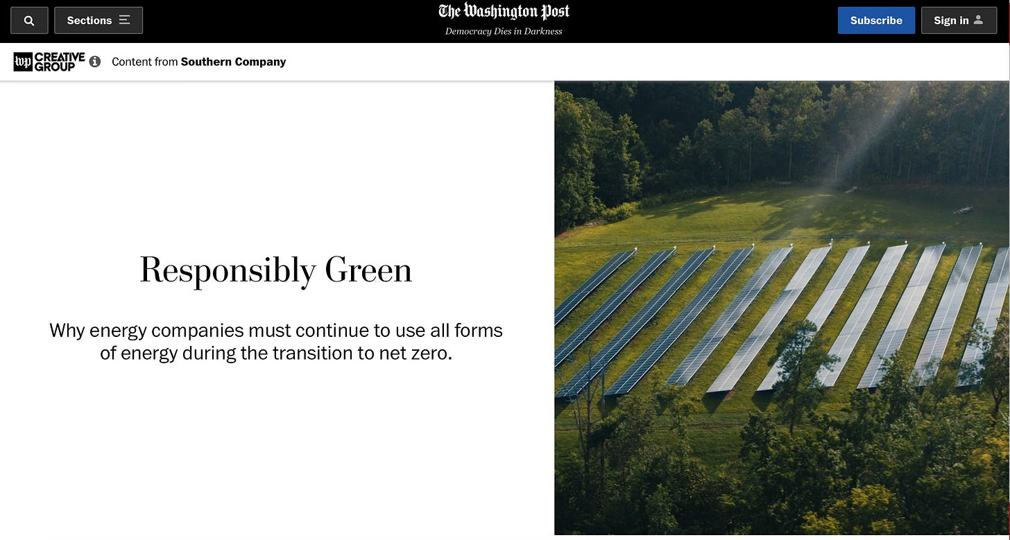 In some cases, outlets run native ad campaigns for corporate clients that undermine their own journalism. One such native ad created by the Washington Post’s content studio claims utility Southern Company is helping to lead the energy transition, despite their role in blocking it and ramping up their reliance on fossil fuels. It also claims energy demand can’t be met by renewables alone, even while the Post’s own reporting demonstrates how transitioning to all renewables can actually decrease energy demand.