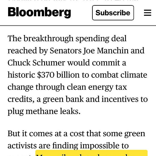 Just a few weeks ago, it appeared that U.S. Senator Joe Manchin — who made his fortune through a family coal business and has extensive ties to Big Oil — had outright killed our chance at any climate legislation (read our eulogy here). But the senator — and the fossil fuel corporations that back him — could, apparently, tolerate an investment in clean energy in exchange for a wishlist of grotesquely harmful oil and gas projects in frontline communities (including in Manchin’s home state of West Virginia). And because Manchin was the key 50th vote, the only climate bill this Congress could pass involved drastically expanded leases, handouts, and subsidies for fossil fuel interests, as well as newly drawn permitting processes for oil and gas infrastructure in many of the same regions the industry has already plundered.