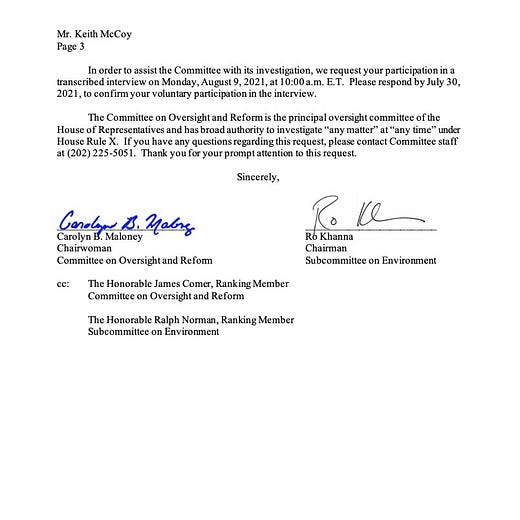 On Monday, Representatives Carolyn Maloney, Chairwoman of the House Committee on Oversight and Reform, and Ro Khanna, Chairman of the House Subcommittee on Environment officially asked that lobbyist, Keith McCoy, for an interview about the fossil fuel industry’s efforts to “spread climate disinformation, including through the use of ‘shadow groups,’ in order to block action to address climate change.”